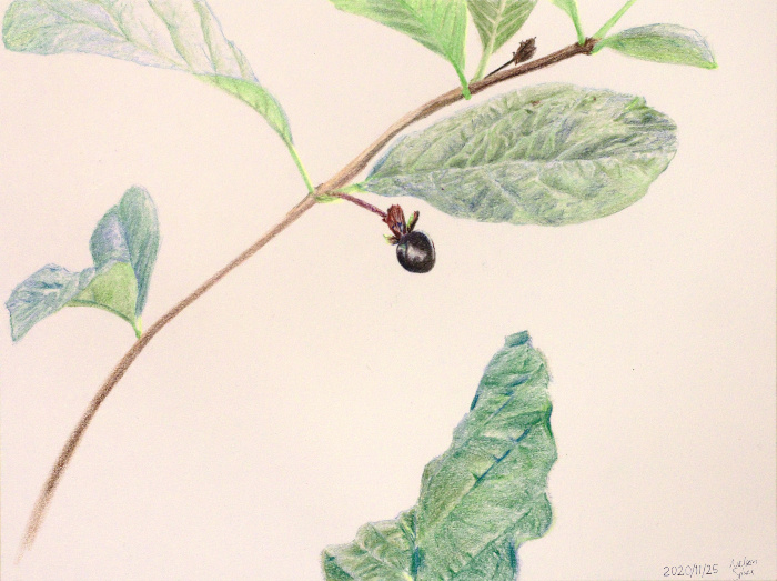 I have recently identified this species since drawing it. This is twinberry honeysuckle. Unfortunately only one berry is visible here!